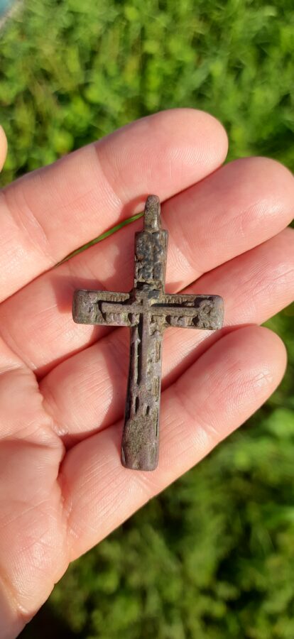 Злосчастный курган, как выяснилось, грабили по меньшей мере четыре раза. В шурфе были обнаружены выброшенная керамика, ружейный кремний, остатки упряжи из железа, а один наш предок в пылу грабежа даже оставил во рву бронзовый мужской нательный крест, что подтвердило версию о национальности и вероисповедании бугровщиков.