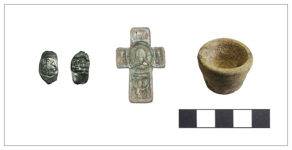 Слева направо: большое пуло, крест с изображениями Спаса Нерукотворного в средокрестии и святого Никиты Бесогона — в изножии, мерная керамическая чашечка