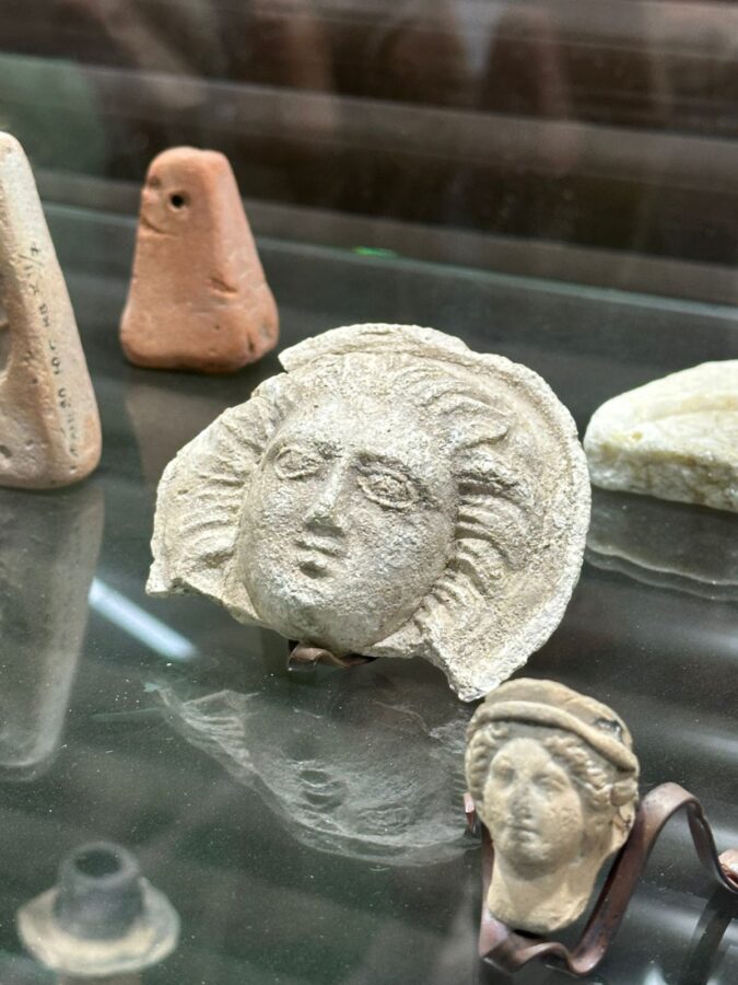 Каждый полевой сезон приносит уникальные артефакты. Одной из ярчайших находок этого года стал фрагмент терракотовой театральной маски, изображающей правую часть лица сатира – спутника бога Диониса. Особенно уникальной ее делает сохранившаяся органическая краска: голубая подводка в уголках глаз и красно-бордовая борода. Маска, датируемая, по всей видимости, II в. до н.э., имеет отверстия для подвешивания и, вероятнее всего, использовалась в ритуальных целях, но, может быть, надевалась актерами во время театральных постановок.