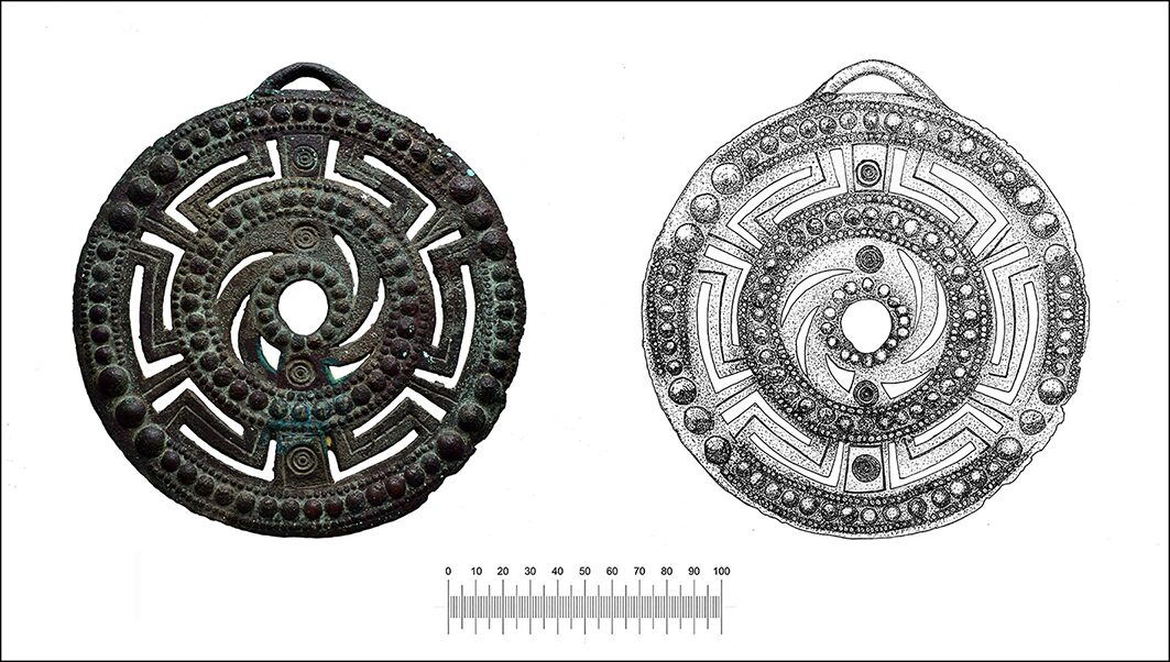 Среди сокровищ — бронзовый солнечный диск с изысканным узором и отверстиями. Такие артефакты обычно находят в женских могилах, намекая на близлежащее захоронение. Солнечные мотивы, вероятно, отражали важную роль небесных символов в культуре и иерархии.