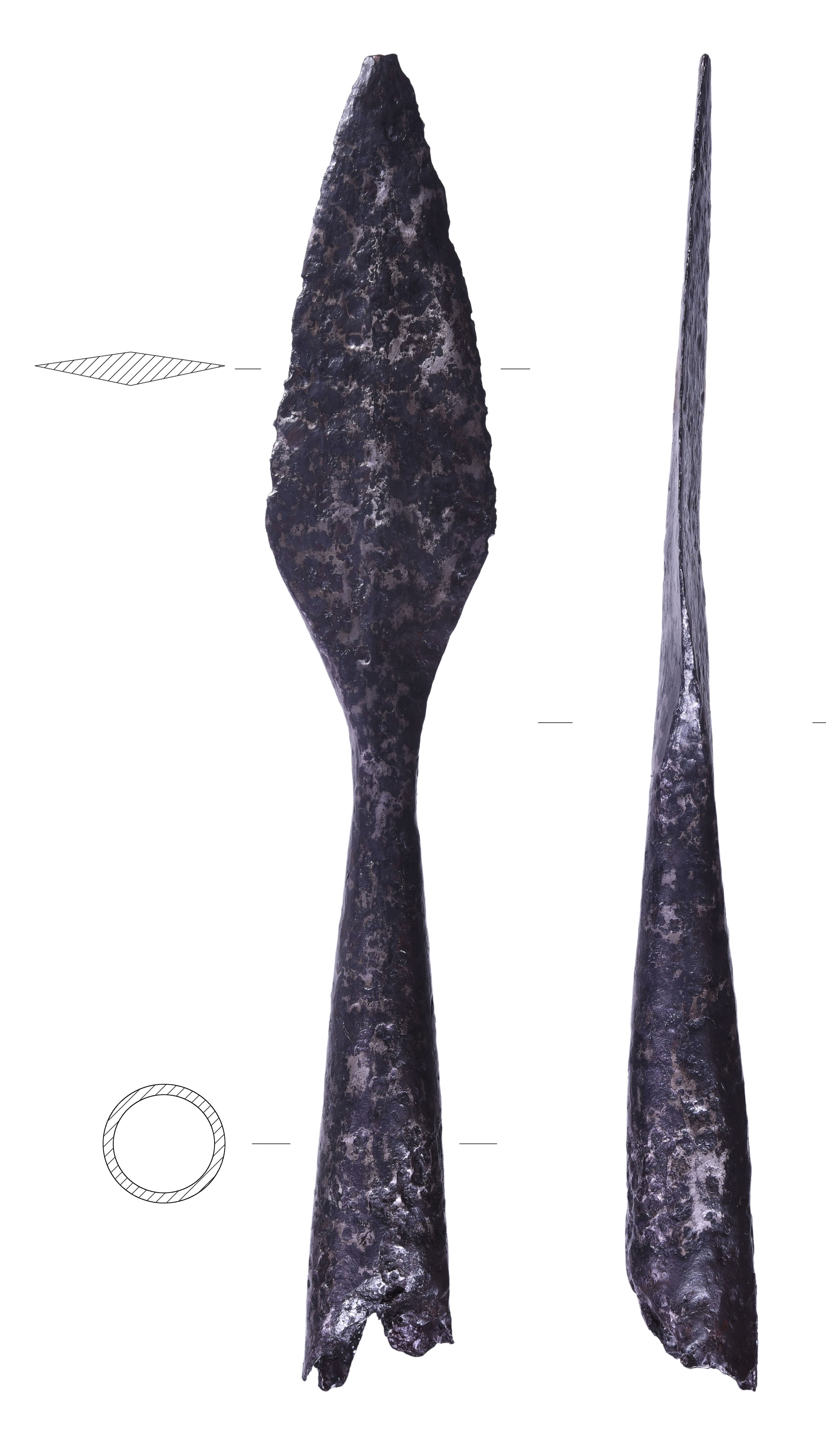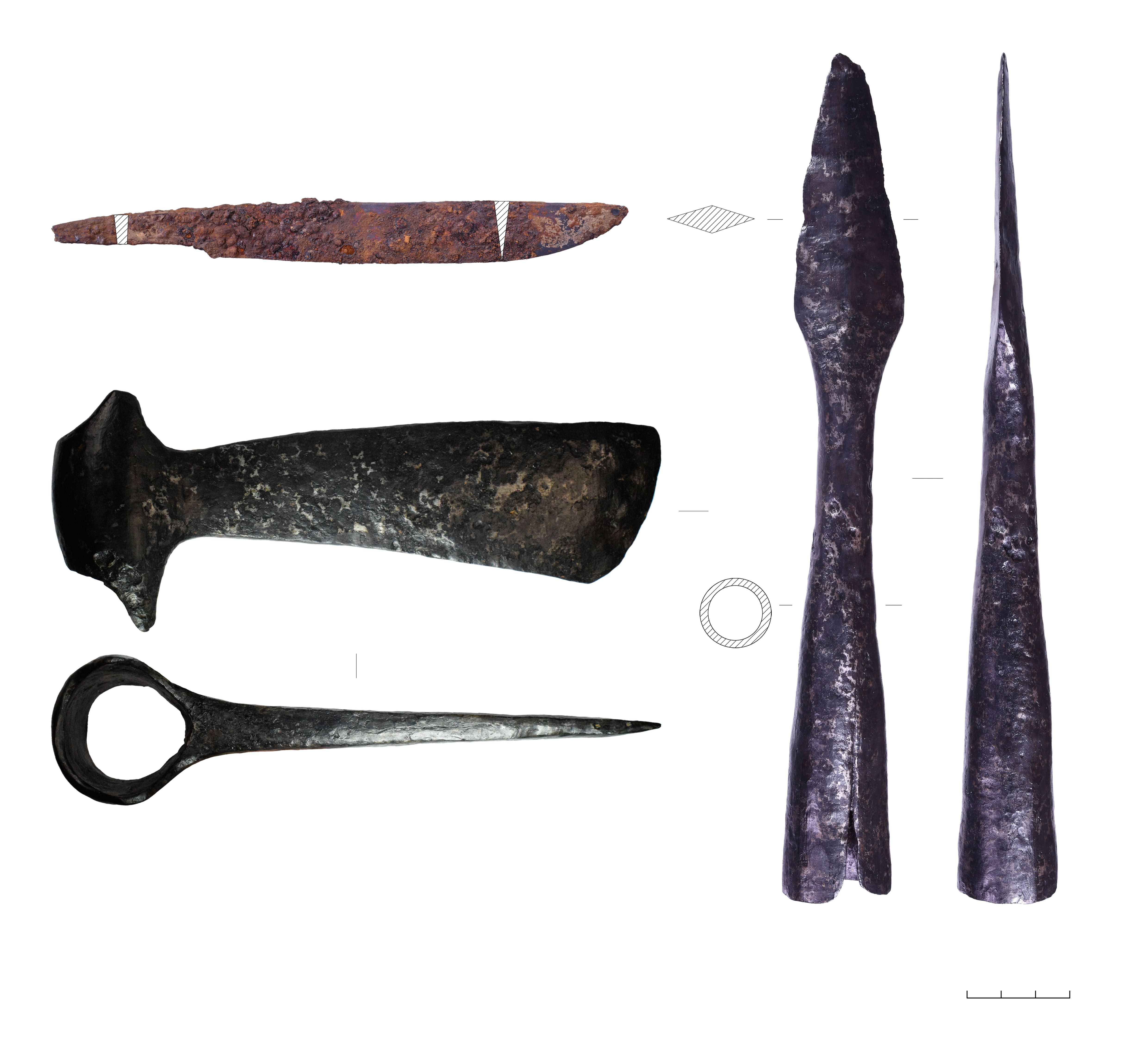 Исследование двух наконечников копий, топора и ножа из состава «оружейных комплексов» методом рамановской спектроскопии, выполненное в ЦКП ИА РАН (оператор Е.Я. Зубавичус), выявило на их поверхности патину из гематита, формирующуюся под воздействием высоких температур. На одном из наконечников дротиков зафиксирован прикипевший фрагмент ошлакованной лепной керамики. Таким образом, можно полагать, что все эти предметы были подняты с мест трупосожжений.