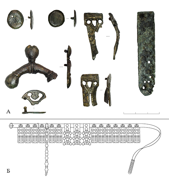 А – детали неволинской поясной гарнитуры с площадки могильника; Б – реконструкция неволинского пояса