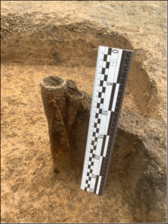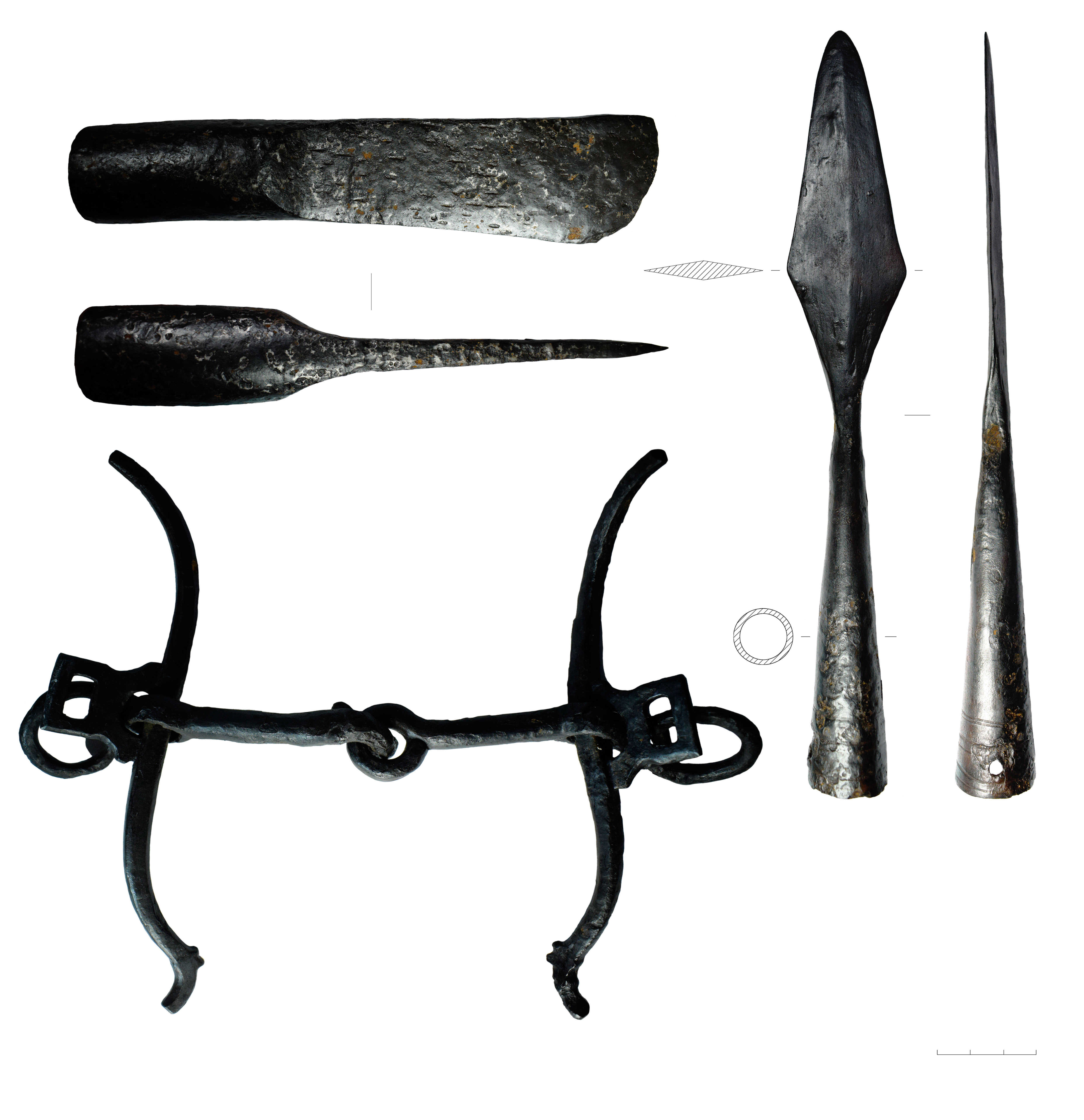 Основными составляющими «оружейных комплексов» были наконечники колющего оружия (копий и дротиков), воткнутые остриями вниз. Они присутствовали в восьми комплексах. Кельты и проушные топоры найдены в семи. В составе ряда наборов имелись ножи и фитильные трубки, удила, металлические детали узды и плети, пряжки от упряжи. Три находки представляли собой одиночные предметы – копья и топор, кельт, четыре комплекса включали наборы из трех или четырех предметов, с присутствием колющего оружия, топоров и ножей с обоймицей или удил. Два комплекса выделялись многочисленностью предметов вооружения и всаднического снаряжения. Создается впечатление, что наконечники копий, топоры и ножи втыкались непосредственно в грунт, а всадническое снаряжение помещались в вертикальном положении в узкие ямы, прорезанные этими предметами. Обряд не предполагал совместного помещения оружия и всаднического снаряжения и человеческих останков. Разрозненные единичные кальцинированные кости собраны в частично сохранившемся гумусированном грунте.