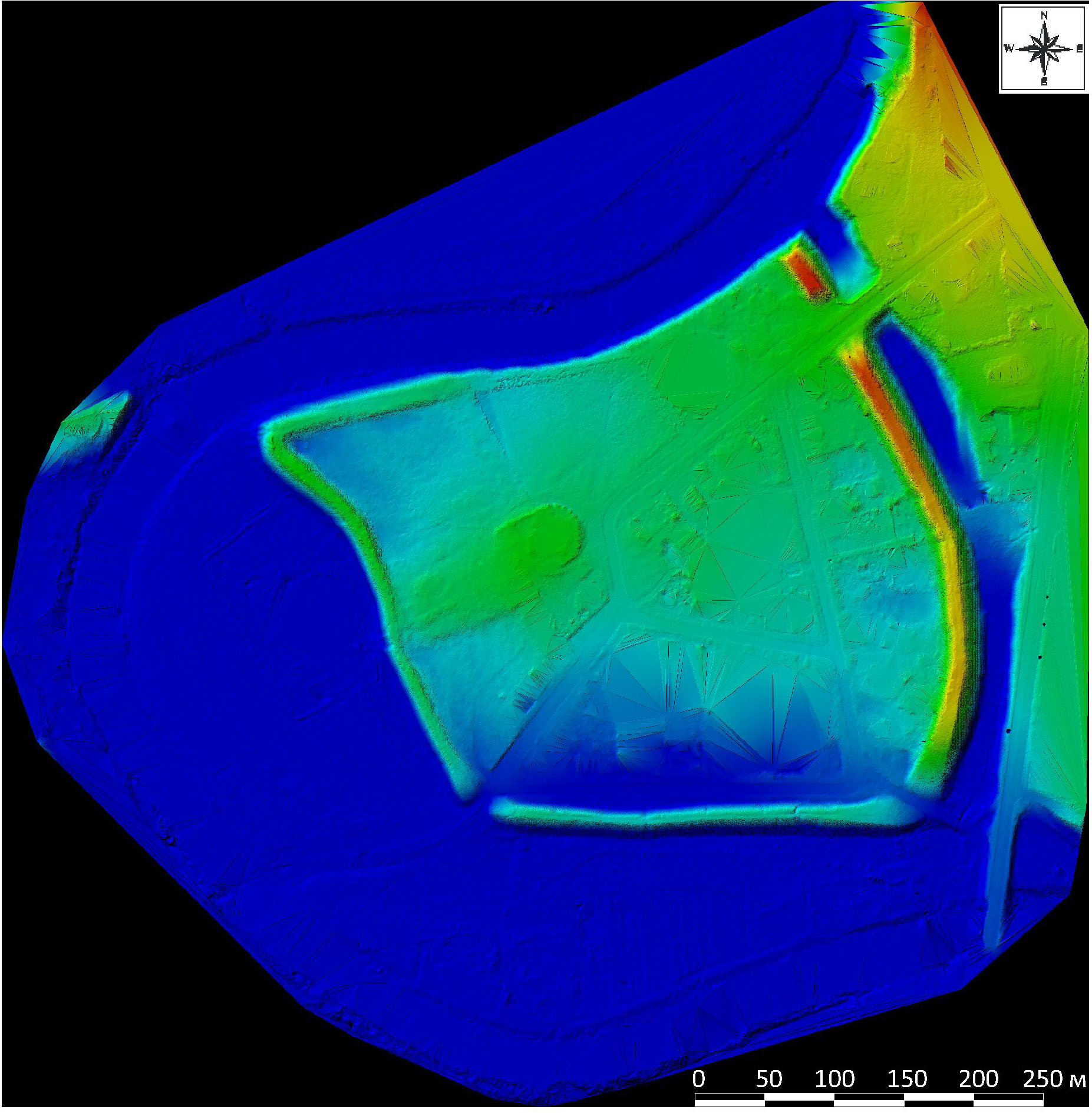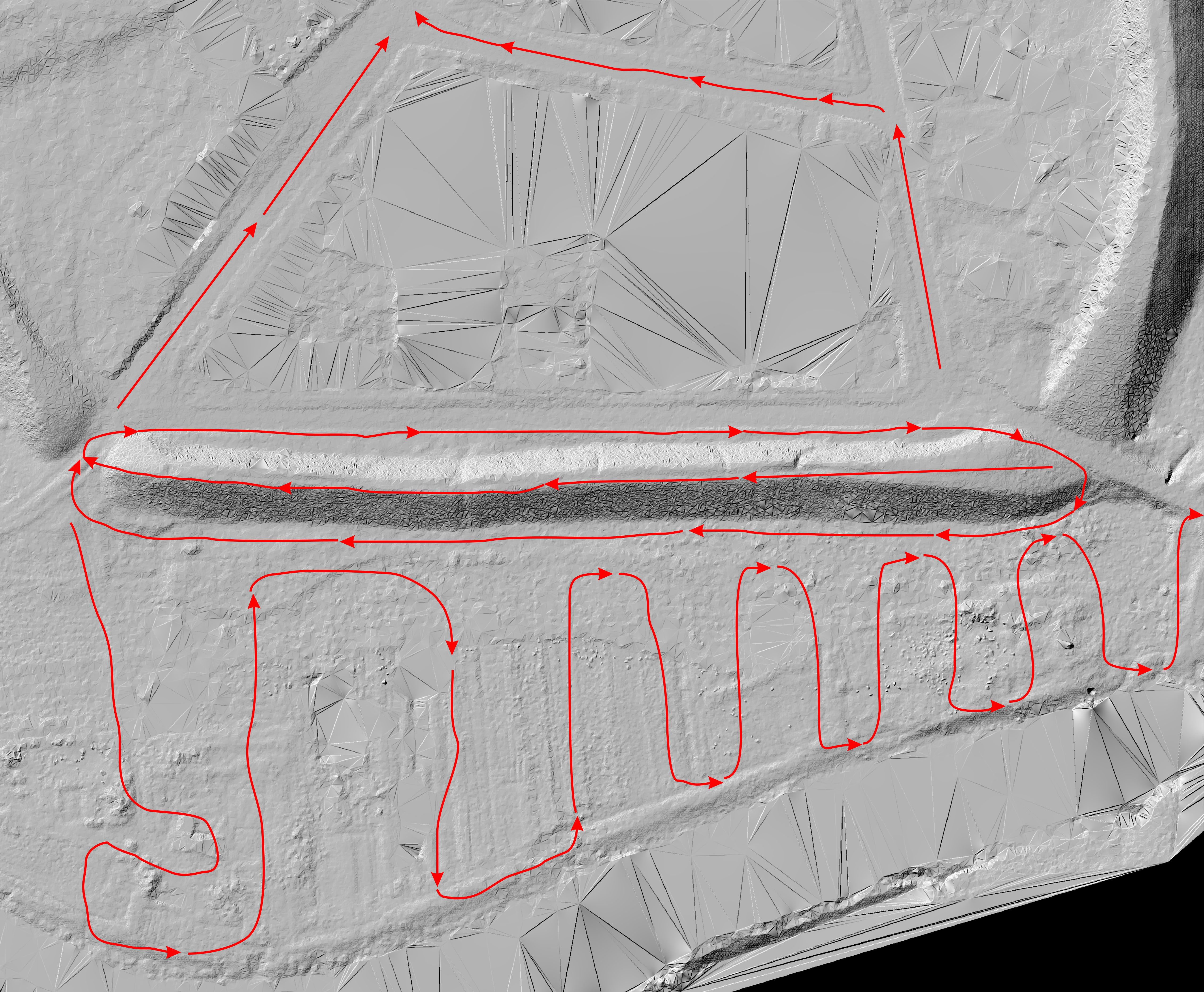 Сканирование Суздальского кремля в 2025 г. производилось ручным лазерным сканером GoSLAM RS100S, в котором используется SLAM технология. Маршрут съёмки строился таким образом, чтобы отсканировать все выраженные в рельефе объекты. В ходе камеральной обработки материалов была проведена состыковка облаков точек между собой, удаление точек шума и классификация поверхности земли. В результате камеральной обработки было получено отклассифицированное облако точек, на основе которого была построена 3D модель поверхности, топоплан (формат dxf) и светотеневые изображения (Hillshade) поверхности.