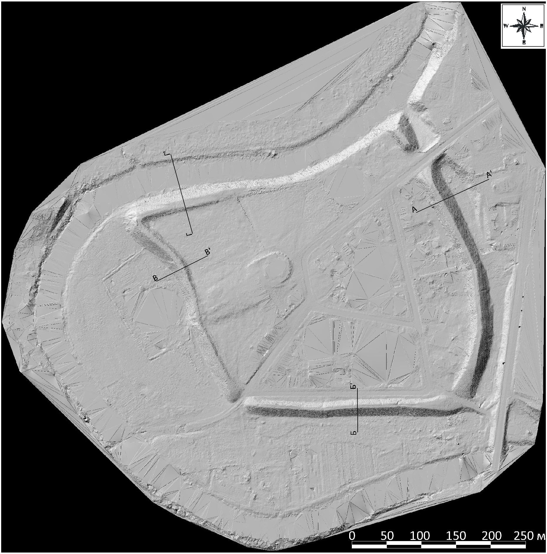 Светотеневое изображение 3D модели Суздальского кремля с указанием мест профилей