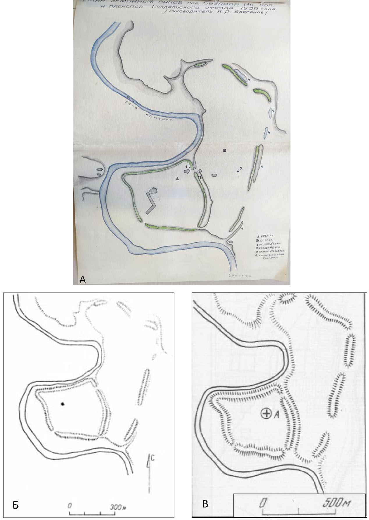 Б – Древний Суздаль по А.Д. Варганову (Археология СССР); В – Суздаль по А.Д. Варганову (Раппопорт П.А. (МИА 105)