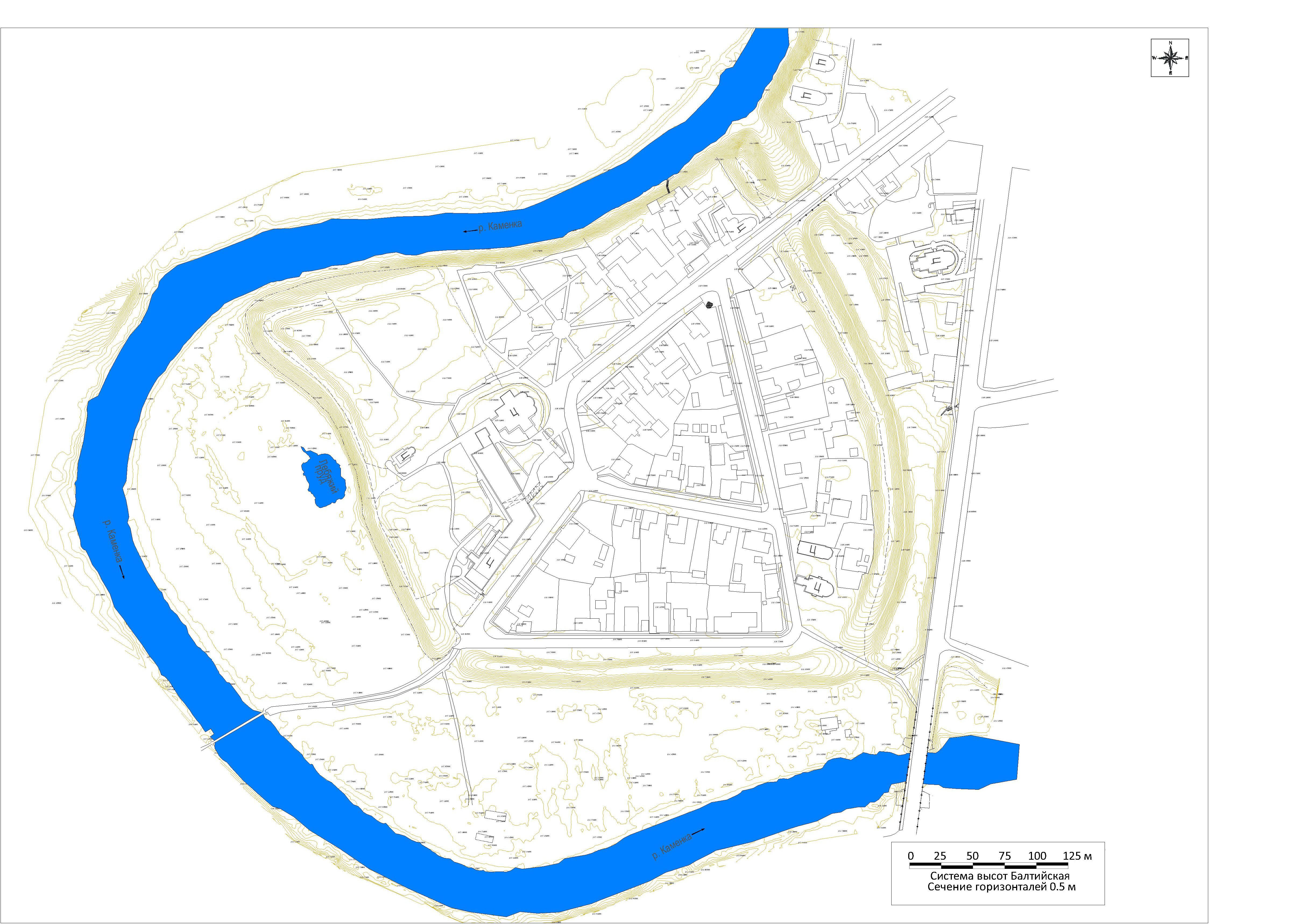 Суздальский кремль – один из наиболее известных примеров укрепленного ядра средневекового города, сохранившего свой ландшафтный облик, элементы пространственной организации и контуры фортификаций с древнейшей поры. Кремлевские валы, ограничивающие участок береговой террасы в излучине р. Каменки, хорошо читаются в ландшафте современного города. Исследователями установлено, что основу кремлевских валов образуют фортификации XI в., впоследствии обновлявшиеся и усиливавшиеся, но не переносившиеся и не менявшие своего положения. Среди городов Северо-Восточной Руси, история которых восходит к X–XI в., Суздаль – единственный, в котором ранее ядро городской территории выделено сохранившимися до наших дней остатками укреплений. План Суздальского кремля («города» по терминологии документов XVII в.) воспроизводится в многочисленных исторических и археологических изданиях как пример мысовой крепости, конфигурация которой определена природным ландшафтом. Это схематичный план, на котором показаны линии валов, река и некоторые элементы рельефа.