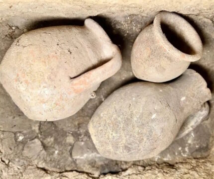 В этрусской погребальной урне, украшенной рельефным изображением лика Медузы Горгоны, вместо ожидаемого пепла и костей были найдены три терракотовых сосуда. Эти сосуды – пара кувшинов с ручками и одна чаша – отличаются простотой и отсутствием декоративных элементов.