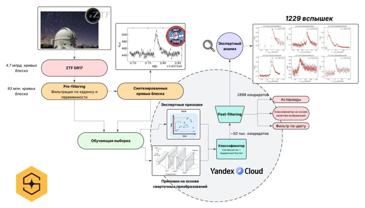 По используемым для обучения данным алгоритм вычислял признаки, которые передавались на вход классификатора, развернутого в облачной инфраструктуре Yandex Cloud. Обученный классификатор затем работал с целевой выборкой, на основании которой сформировал список потенциальных вспышек на красных карликах. Далее этот список прошел пост-фильтрацию: из него исключили астероиды, а также выполнили дополнительную классификацию на основе качества изображений и цвета. На заключительном этапе авторы проверили полученный список и сформировали финальный каталог вспышек — в него вошли 1229 вспышек на красных карликах за 2018–2020 годы.