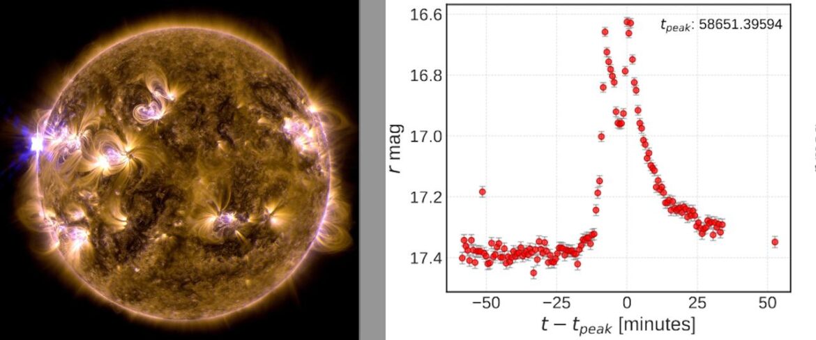 Изображение вспышки на красном карлике (слева) и пример найденной кривой блеска в данных ZTF (справа). Источник: Анастасия Лаврухина.