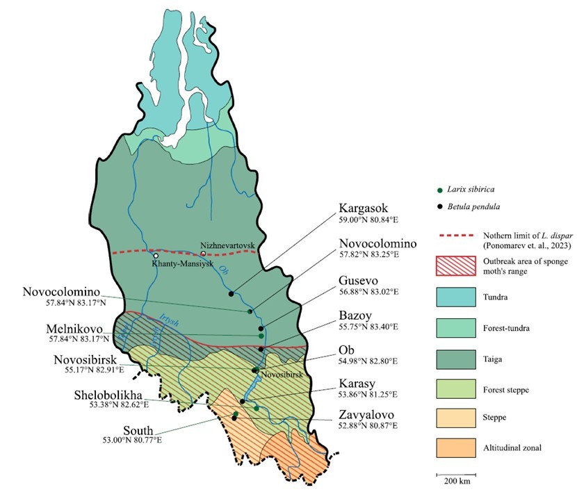 Авторы взяли образцы хвои и листьев с деревьев, произрастающих в разных районах Западной Сибири, чтобы сравнить, как градиент географической широты влияет на концентрацию защитных соединений. Самая северная точка сбора образцов находилась возле села Каргасок Томской области, а самая южная — возле села Завьялово Новосибирской области (на 1000 километров южнее первой).