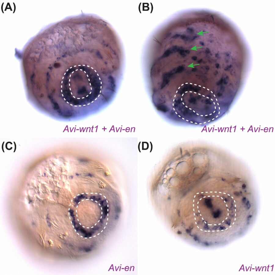 Зоны активности генов engrailed и wnt1 у нереиса Alitta virens на личиночной стадии. Источник: Kairov and Kozin / Evolution and Development, 2025.