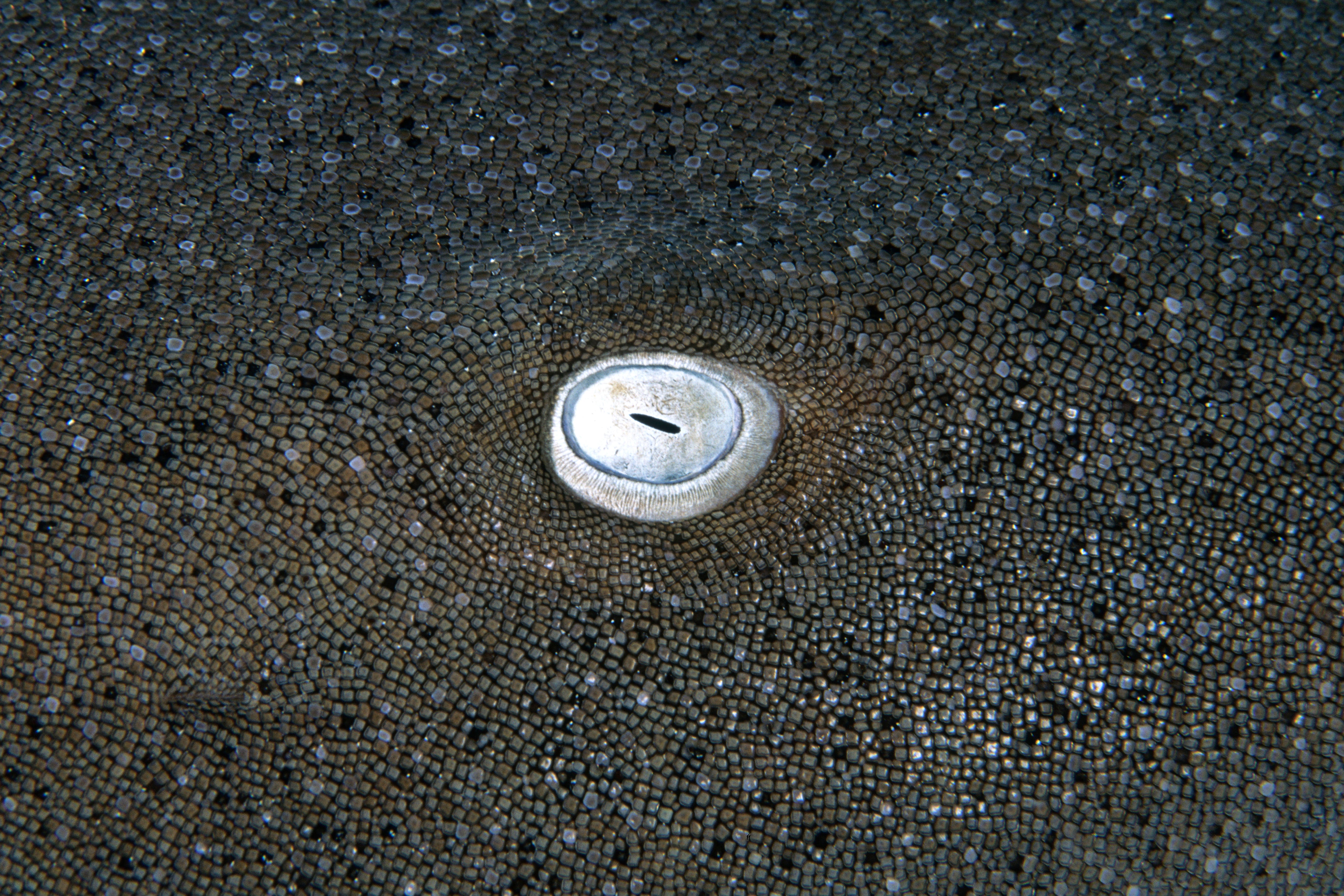 Глаз усатой атлантической акулы-няньки. Усатая акула не кусает своих жертв, а как бы засасывает их огромным поцелуем (нянчится).