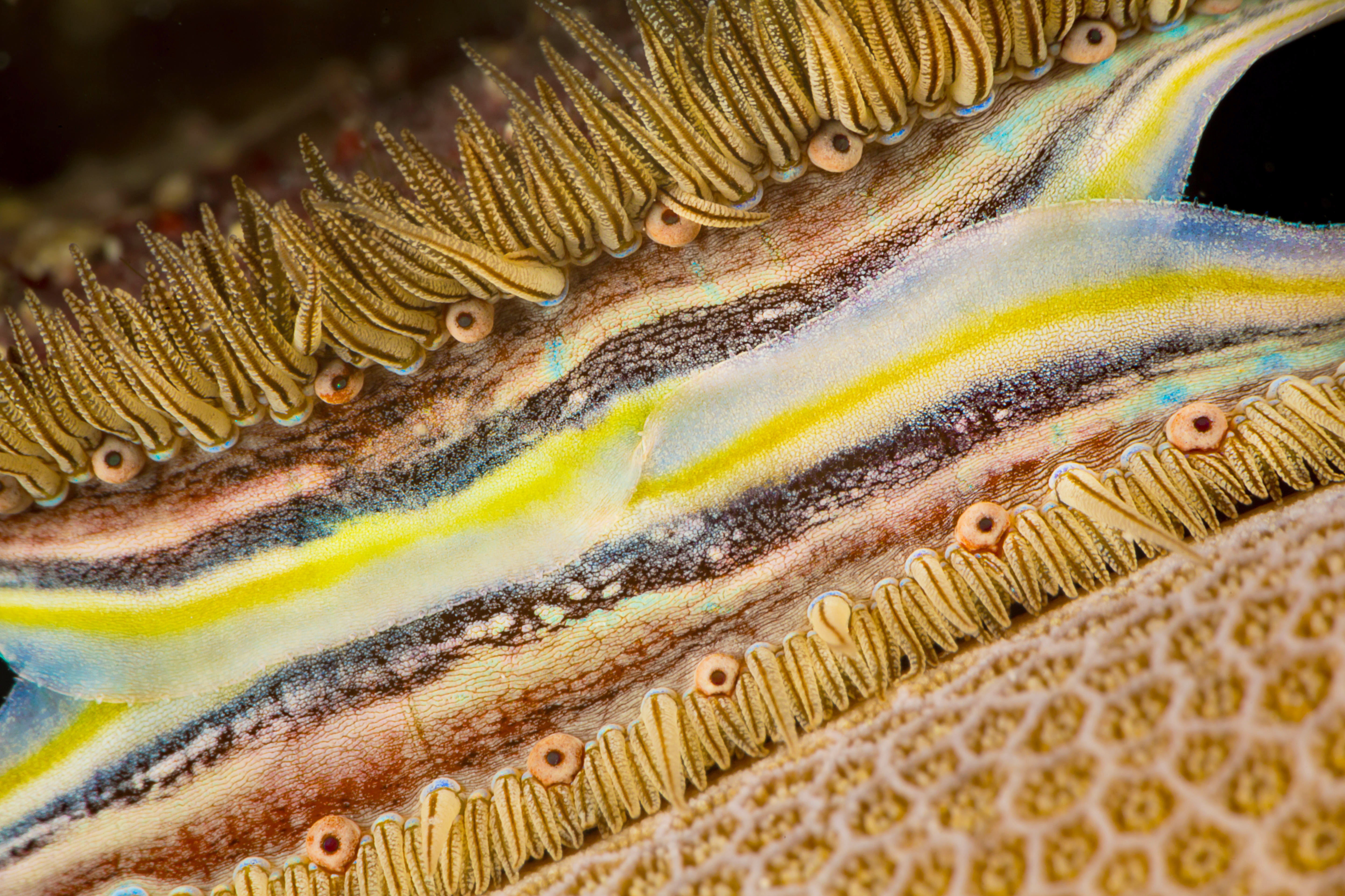 Цветной глаз кораллового гребешка. Гуаниновые кристаллы в глазах гребешка отражают свет (как чешуйки карпа) и работают как рефлекторные телескопы со сложной системой зеркал.