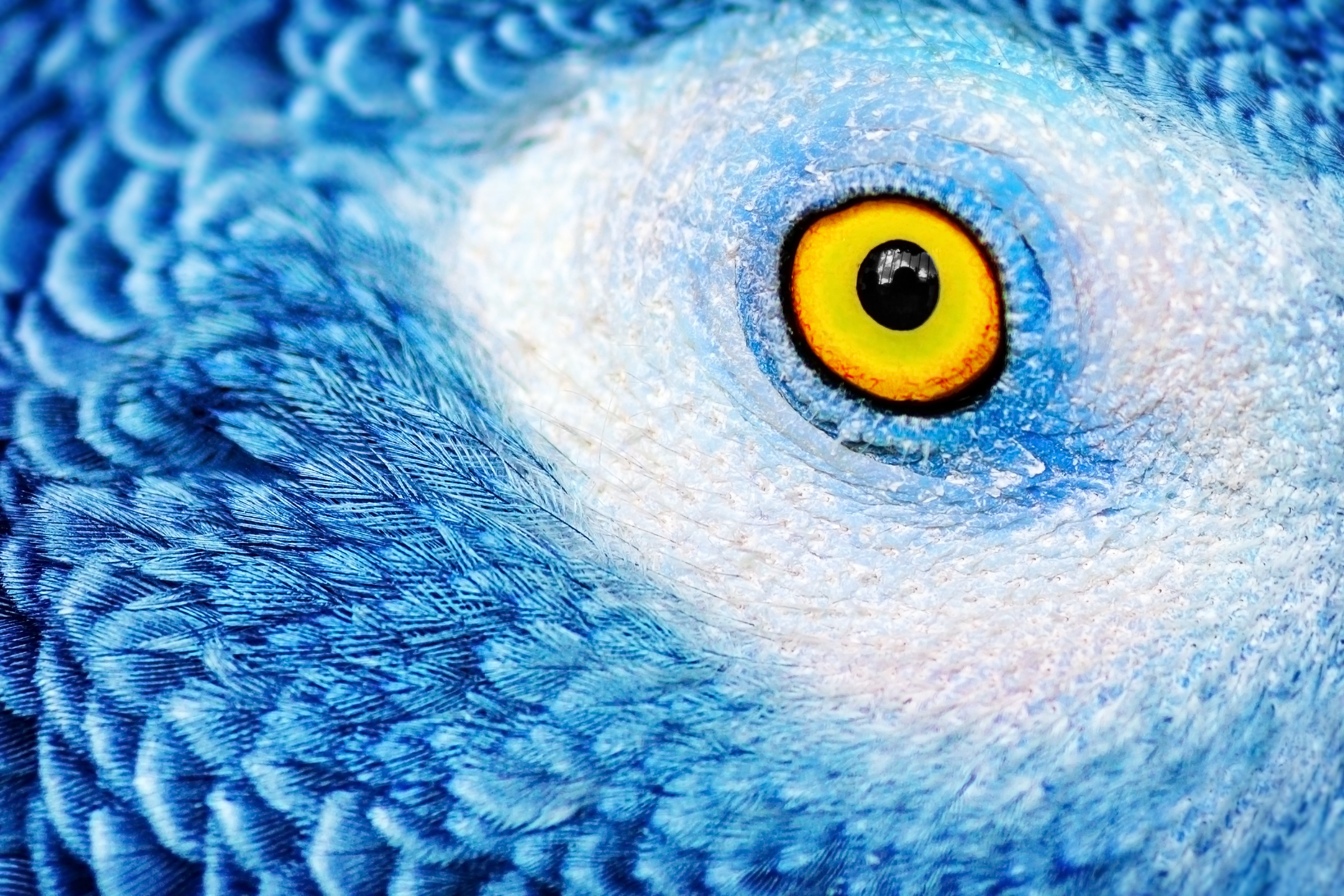 Желтый глаз синего попугая. Видит в ультрафиолетовом диапазоне.