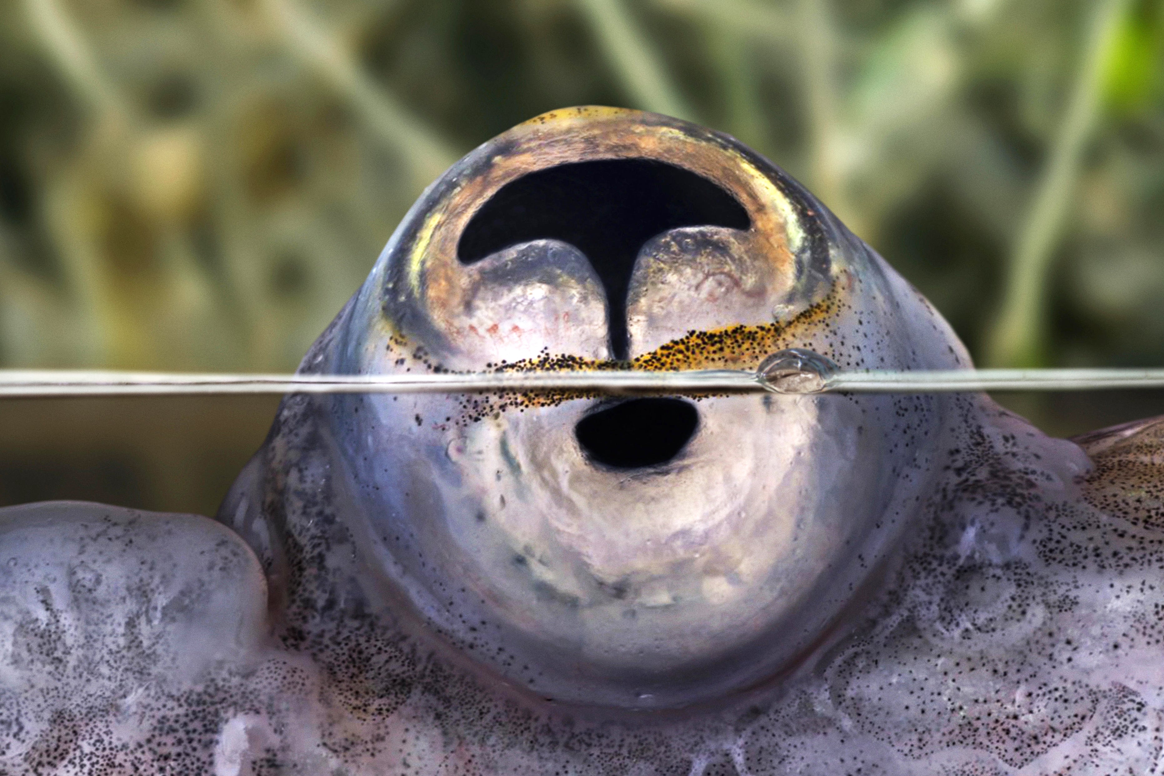 Четырехглазая рыба. Глаз у этого вида — изображенный здесь — имеет две доли. Один находится над ватерлинией, а другой — под ней, давая прозвище «четырехглазый» рыбе, которая курсирует по поверхности воды в поисках плавучих закусок.