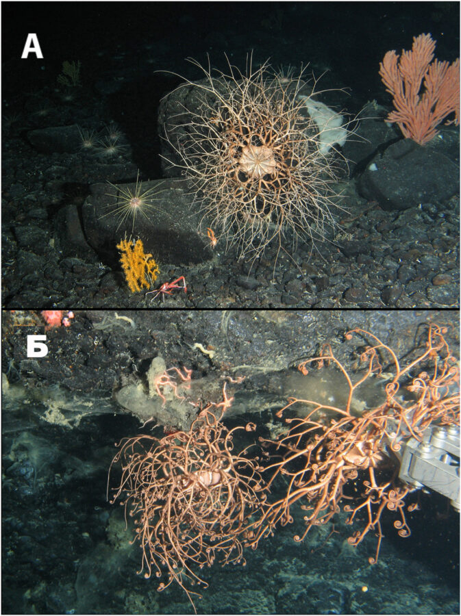 Фото 1. Офиуры сем. Gorgonocephalidae, обнаруженные на Императорской цепи подводных гор. (A) Gorgonocephalus sp. на вулканической породе (LV94-5, Киммеи, глубина 850 м). (Б) Gorgonocephalus eucnemis на вулканической породе (LV94-11, гайот Коко, глубина 1410 м).В статье Анастасии Волковой с соавторами показаны видовой состав офиур подводных гор Императорской цепи, распределение видов по глубинам, их биогеографические особенности и таксономическая структура сообществ. Исследование основано не только на коллекциях, но и на анализе более 70 часов видеоматериала, полученных с использованием телеуправляемого необитаемого подводного аппарата (ТНПА) Comanche 18.