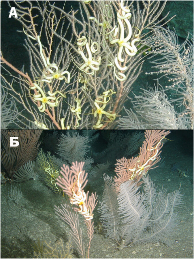 Фото 2. Офиуры семейства Euryalidae, ассоциированные с восьмилучевыми кораллами. (A) Эвриалиды, ассоциированные с восьмилучевыми кораллами рода Callogorgia (LV94-3, гайот Коко, глубина 375 м). (Б) Эвриалиды, на коралле семейства Primnoidae (LV94-3, гайот Коко, глубина 375 м).