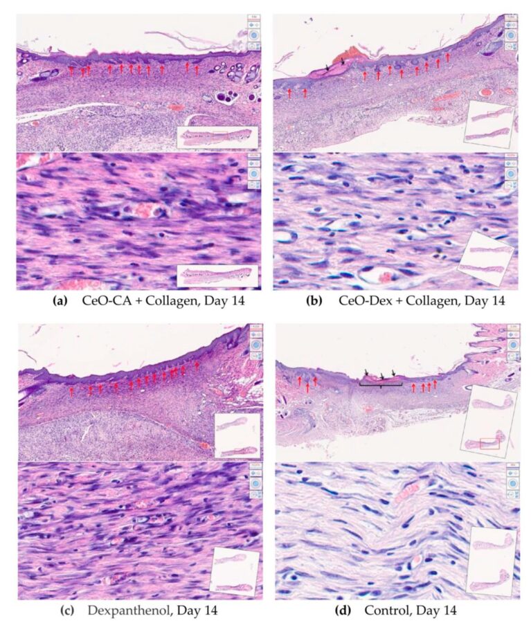 Затем участники исследовательского коллектива совместно с исследователями из Курского государственного медицинского университета (Курск) протестировали разработку на лабораторных животных со смоделированными глубокими кожными ранами. Авторы сравнили три группы крыс: первой на раны нанесли коллаген-наноцериевый гидрогель, второй — применяемый в клинической практике препарат декспантенол, а у животных из третьей группы раны заживали самостоятельно.