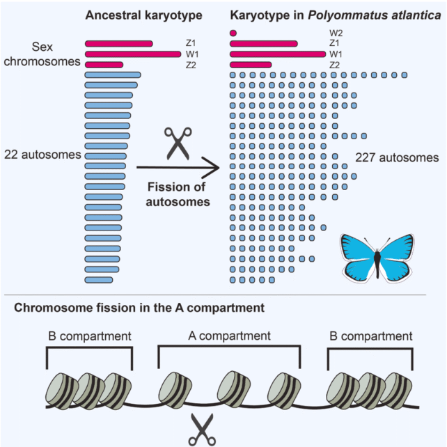 Исследователи предполагают, что за относительно короткий период времени, около трех миллионов лет, аутосомы (неполовые хромосомы) бабочки претерпели существенную фрагментацию. В результате сотен событий "разделения" исходные 24 хромосомы предков превратились в 229. Разрывы происходили в областях ДНК, где она была менее плотно скручена, что облегчало их распутывание.