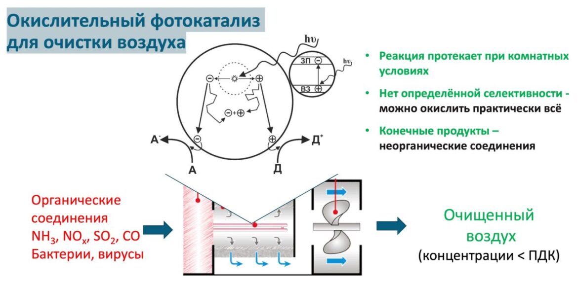Для решения задачи по удалению молекулярных примесей из газовоздушных смесей используются разные подходы, но наиболее эффективным способом очистки воздуха от малых концентраций загрязняющих веществ при комнатных условиях является фотокаталитическое окисление. Данный способ окисления основан на том, что под действием квантов света с энергией, превышающей ширину запрещенной зоны полупроводникового фотокатализатора, происходит образование электрон-дырочных пар в объеме фотокатализатора. Образовавшиеся электрон и дырка могут мигрировать к поверхности фотокатализатора и принимать участие в окислительно-восстановительных реакциях с адсорбированными соединениями. Тем самым обеспечивается высокая скорость окисления даже в случае малых концентраций загрязняющих веществ при комнатных условиях.