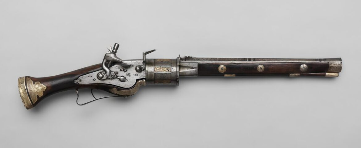 Следующей вехой в истории огнестрельного оружия было появление скорострельных систем. Примером скорострельной системы служит револьвер. Обычно револьверы ассоциируются с именем американца Сэмюэла Кольта, придумавшего в XIX веке канонический револьвер с шестизарядным самовращающимся барабаном. Но на самом деле сама идея многозарядной вращающейся конструкции, прикрепленной к стволу, зародилась гораздо раньше — вероятно, еще в XVI столетии. Образцы старинных револьверов сегодня можно увидеть в Оружейной палате и Государственном Эрмитаже. От кольта их отличало то, что барабан приходилось вращать вручную, да и количество зарядов могло варьироваться. Но самое важное различие связано с тем, как производится выстрел. Если в кольте действует система центрального воспламенения за счет того, что он заряжается патронами — капсулами, содержащими пулю и порох, — то ранние револьверы стреляли за счет замочного механизма. И хотя до полной автоматизации понадобилась еще пара веков, револьвер с самого начала своего появления в XVI веке был сенсационным изобретением. «Его не нужно было перезаряжать после каждого выстрела, — говорит Александр Ковалев, — поэтому револьвер классифицируют не просто как многозарядное, но и как скорострельное оружие».