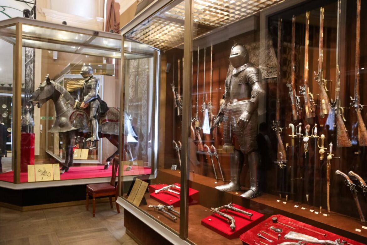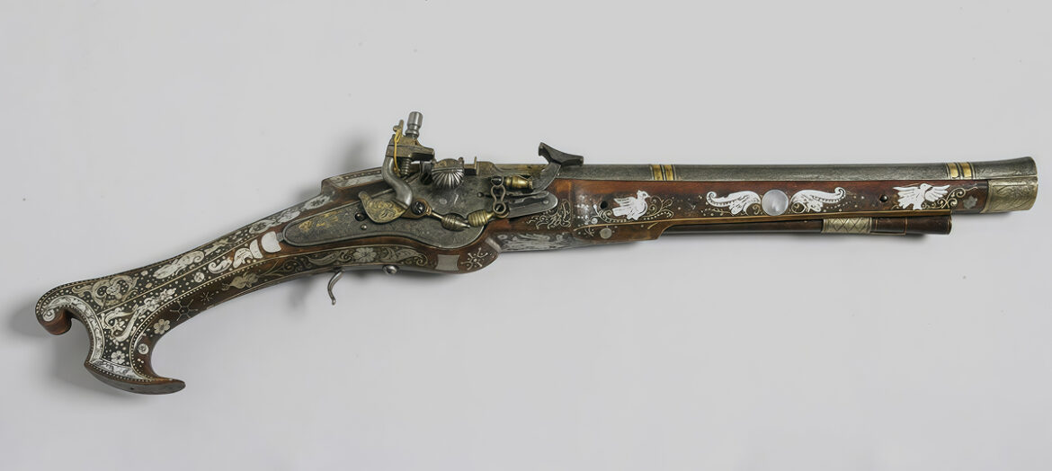 Зато сохранилось несколько высококлассных пищалей и пистолетов с ударно-кремневым замком, вытеснившим к середине XVII века другие виды замочных механизмов. Как видно из названия, оружие с такими замками стреляет за счет удара куска кремня об огниво. В наружной части механизма действуют два элемента: курок с прикрепленным к нему кремнём и огниво, прикрывающее полку, куда засыпан порох. При нажатии на спусковой крючок кремень, ударяясь об огниво, высекает искру и откидывает крышку, закрывающую полку с порохом. Порох воспламеняется, и пламя через запальное отверстие попадает внутрь ствола, где находятся основной заряд и пуля — происходит выстрел. Конструкция была столь эффективна, что продержалась в военном обиходе вплоть до начала XX века.