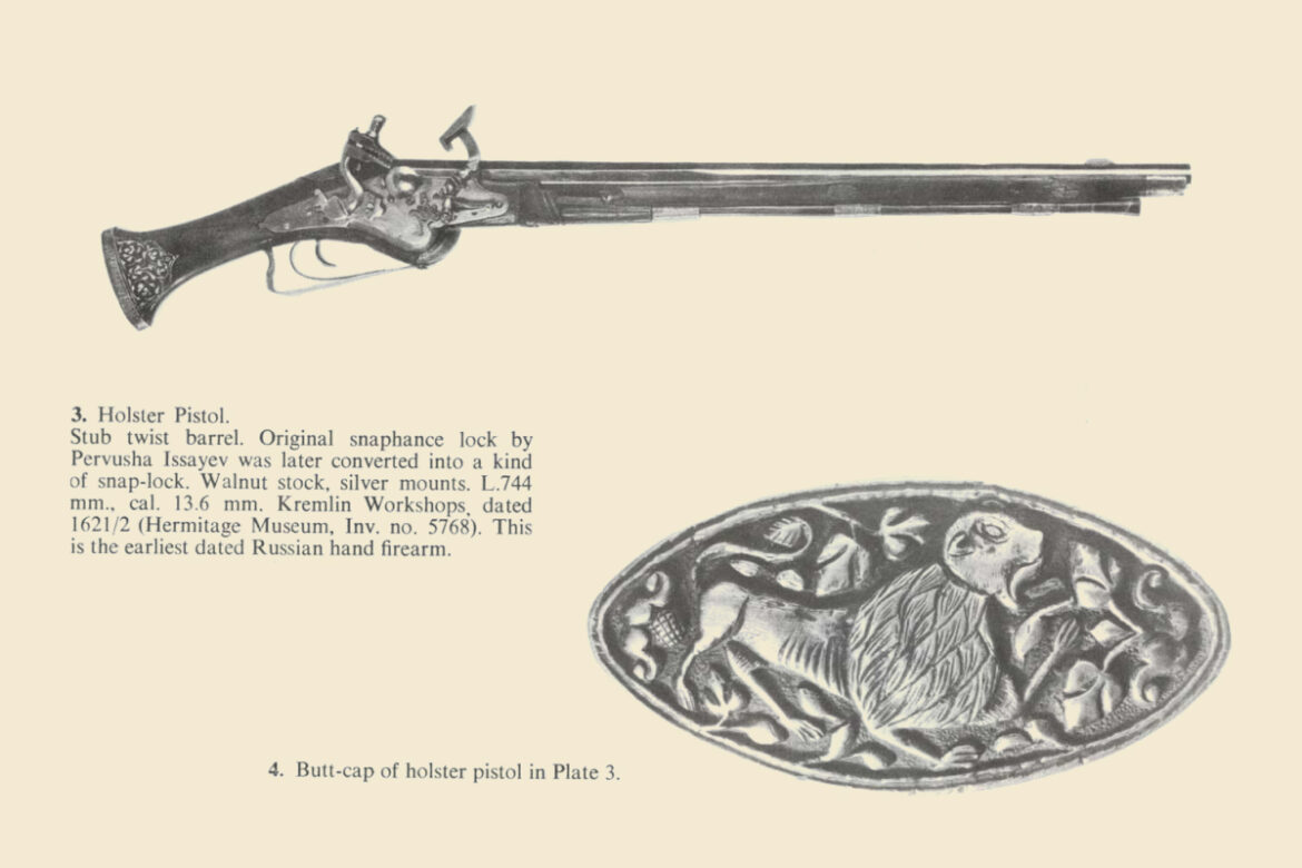 Так, самый ранний датированный русский пистолет, сохранившийся до наших дней, был выдающимся во всех отношениях предметом оружейного искусства, созданным где-то между 1621 и 1622-м годами. И мы точно знаем, что замочного мастера, приложившего руку к этому превосходному изделию, звали Первуша Исаев.