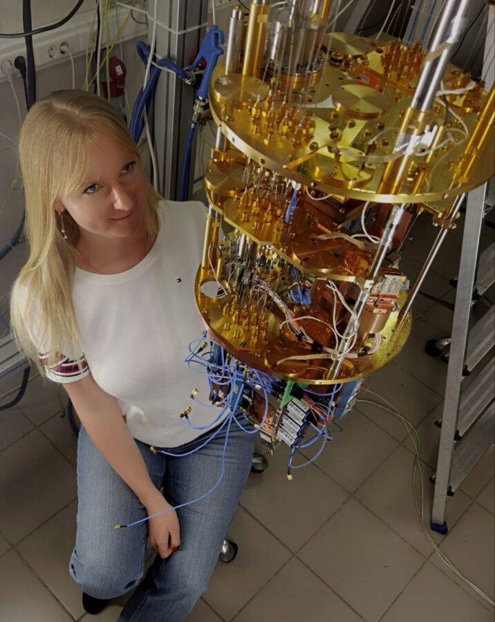 Марина Бастракова возле криостата для измерения кубитов в лаборатории искусственных квантовых систем МФТИ. Источник: Марина Бастракова.