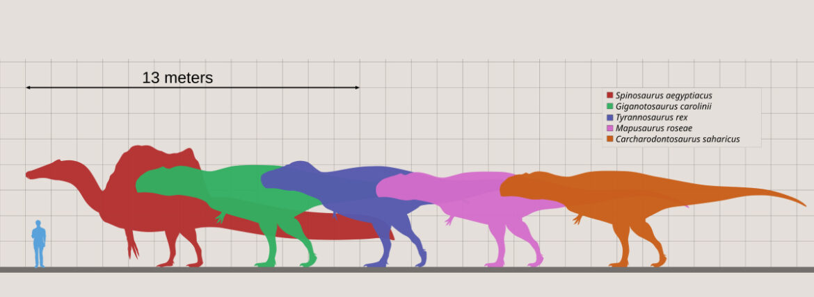 Палеонтологи не имеют однозначного ответа на этот вопрос. Скорее всего, гиганотозавры и тираннозавры обладали схожими размерами с длиной тела от 12 до 13 метров.