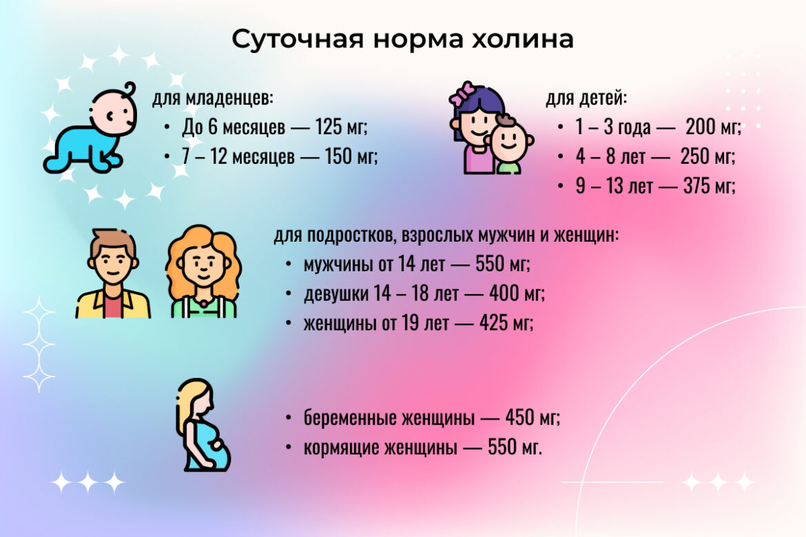 Детям необходимо получать от 125 до 400 мг холина в сутки, а рекомендованная норма для взрослых варьируется от 425 до 550 мг.