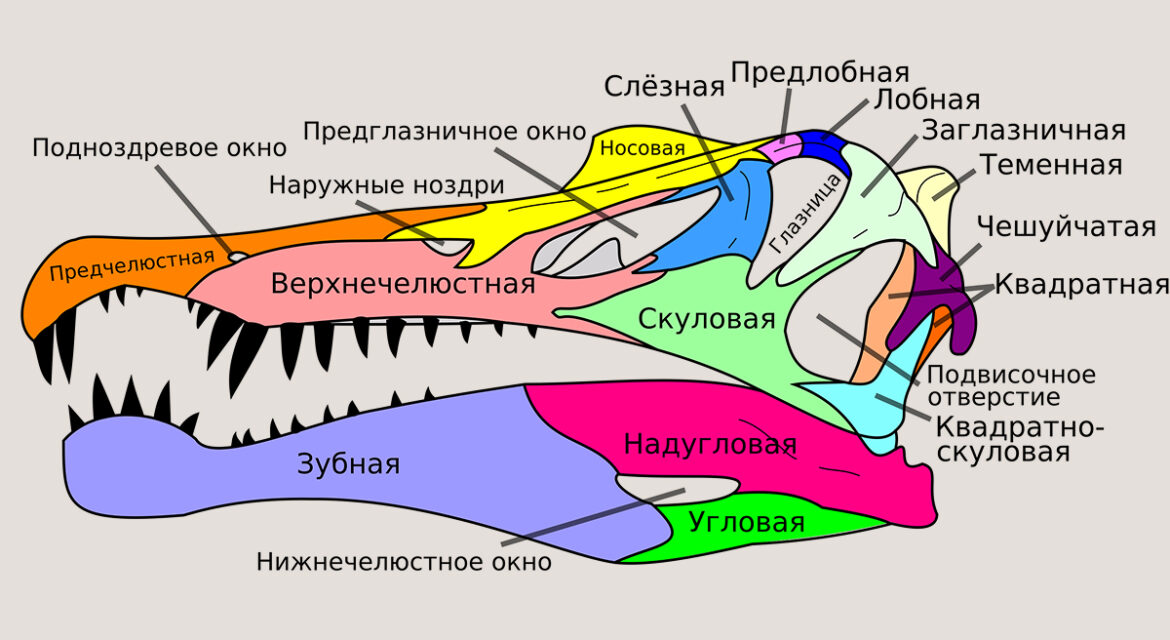 У спинозавров были длинные и узкие черепа с острыми коническими зубами. Похожее строение черепа имеют современные крокодилы.