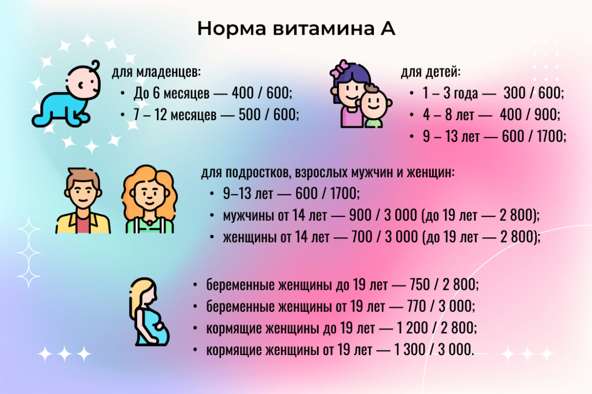 Суточная норма витамина A для детей составляет 300–600 мкг. В возрасте от 14 лет мужчинам необходимо принимать 900 мкг, а женщинам — 700 мкг ретинола в сутки.