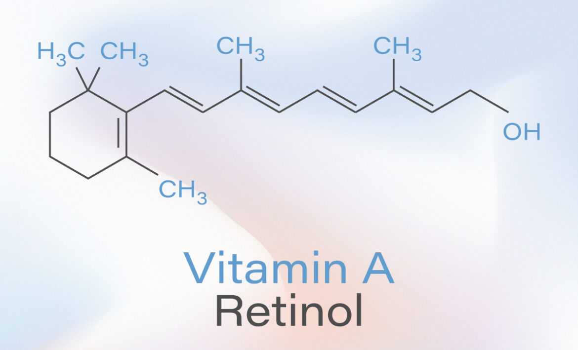 Основной формой витамина A считается ретинол, который иногда называют витамином A1. Молекула этого вещества состоит из атомов 3 химических элементов и имеет формулу C20H30O. Структурную основу, или своеобразный «скелет» ретинола составляет бета-иононовое кольцо — циклическое соединение с двойными химическими связями. Это кольцо соединено с изопреноидной боковой цепью. Ее можно сравнить с «хвостом» молекулы, который определяет жирорастворимую природу витамина и придает ему следующие свойства: