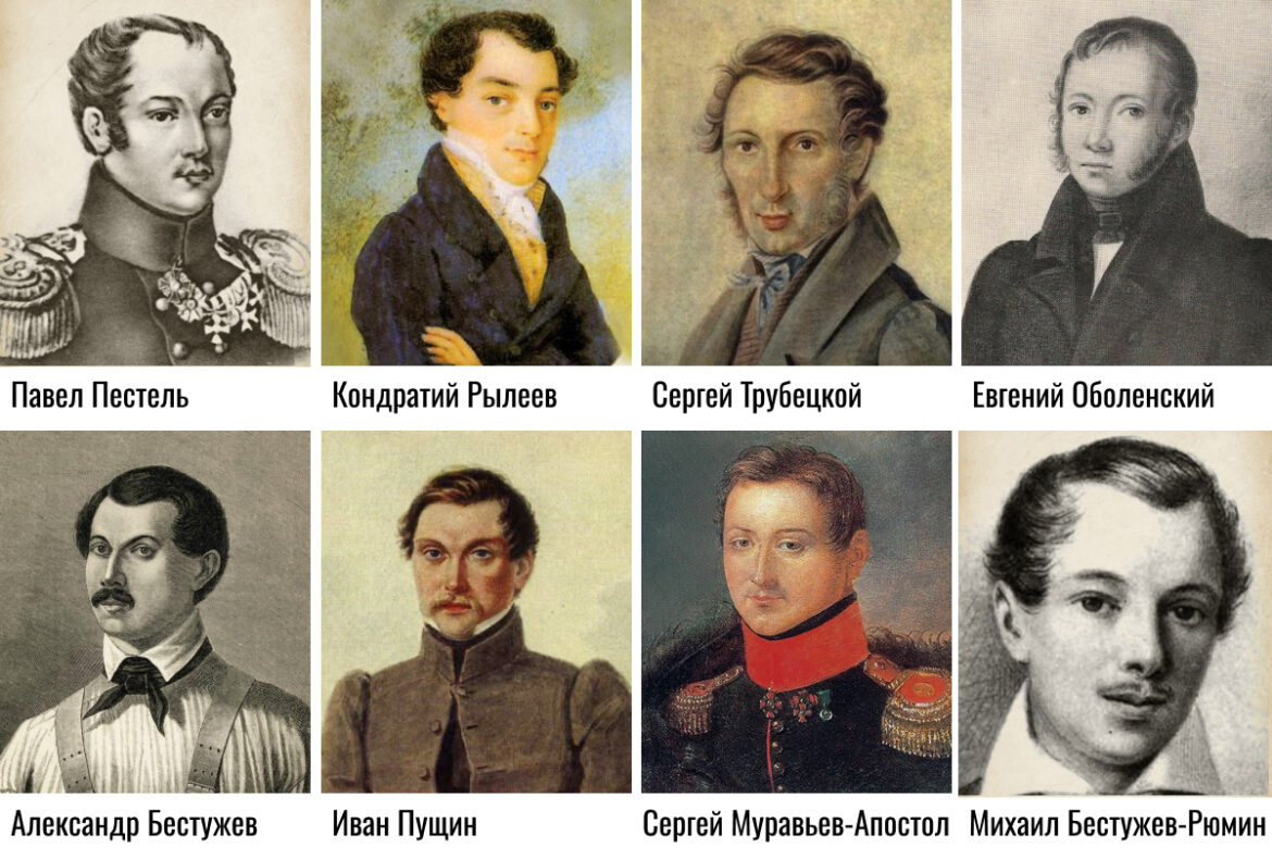 В политике наиболее значимое слово сказали Павел Пестель, глава южного общества и автор «Русской правды», и Никита Муравьев, возглавлявший Северное общество и написавший «Конституцию». В экономической науке отличились Николай Тургенев со своей работой «Опыт теории налогов» и Николай Бестужев с работой «О свободе торговли и вообще промышленности», в литературе – поэты Кондратий Рылеев, Федор Глинка, Вильгельм Кюхельбекер.