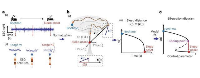Исследователи проанализировали тысячи записей ЭЭГ и построили математическую модель, чтобы увидеть, как мозг движется от бодрствования к сну. На графике это выглядит как шар, катящийся по склону — сначала медленно, а потом вдруг падающий в пропасть.