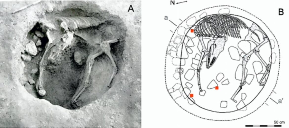 Скелет лошади, состоящий из 712 костных фрагментов, располагался на правом боку у восточной стенки ямы. Голова животного была запрокинута назад. Человеческие останки, включающие 687 фрагментов с признаками воздействия высоких температур, указывают на частичную кремацию женщины перед погребением. Этот ритуал отличается от общепринятого захоронения того времени, когда тело полностью сжигали, а пепел помещали в урну.