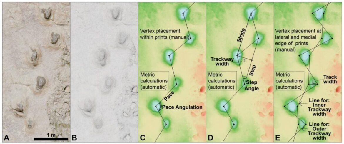 Цифровая реконструкция показала два важных эффекта. Во-первых, ширина между левыми и правыми отпечатками менялась по мере движения: от узкой к заметно более широкой. Это означает, что по короткому ровному фрагменту следов легко сделать неверный вывод о «типичной» походке динозавра.