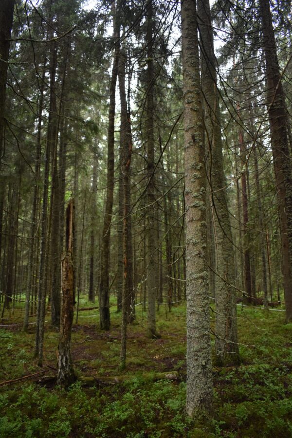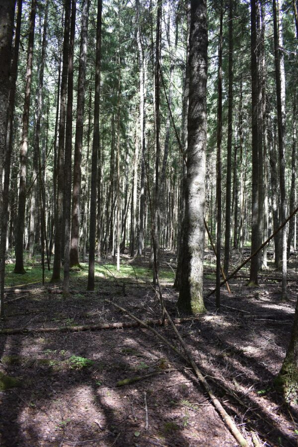 Еловая хроносерия: ельник с березой и единичной сосной чернично-зеленомошный, возраст 115 лет. Фото И.Н. Семенкова, национальный парк «Смоленское Поозерье», 2021 год
