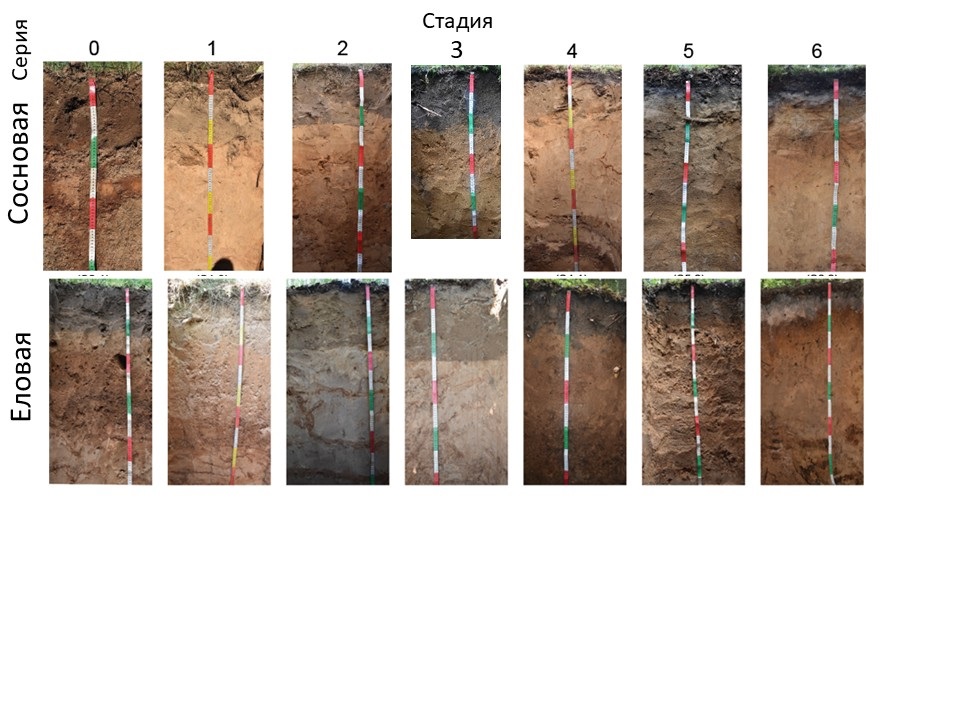 В пределах национального парка «Смоленское Поозерье» ученые выбрали 45 участков, характеризующих 7 стадий восстановления сосновых и еловых лесов (сосновая и еловая хроносерии). Пашни и молодые залежные луга рассматривались как начальные стадии: 0 и 1 соответственно, а старовозрастные участки леса, которые оставались нетронутыми в течение более 100 лет, были приняты за конечную, 6-ю стадию. На каждом участке было заложено по одному почвенному разрезу, из которых суммарно отобрано 366 почвенных проб.
