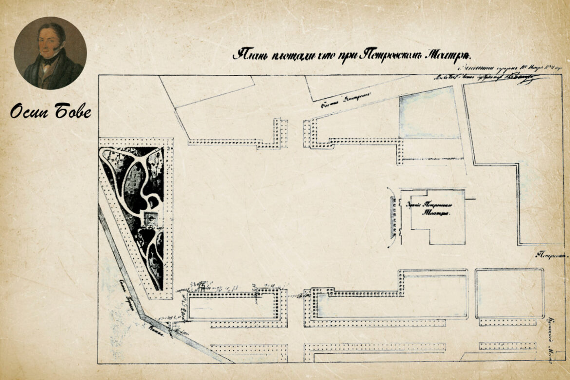 К разработке плана будущей Театральной площади был привлечен архитектор Осип Иванович Бове. План предусматривал прямоугольную площадь, ограниченную четырьмя симметричными зданиями, разделенную посередине проездом. Бове разместил на продольной оси площади здание Большого Петровского театра (прим.ред.: В 1853–1856 годах слово «Петровский» исчезло из названия театра, и он стал называться просто «Большой»), а напротив, у китайгородской стены, – сквер (в котором сейчас можно увидеть памятник Карлу Марксу, установленный в 1961 году).