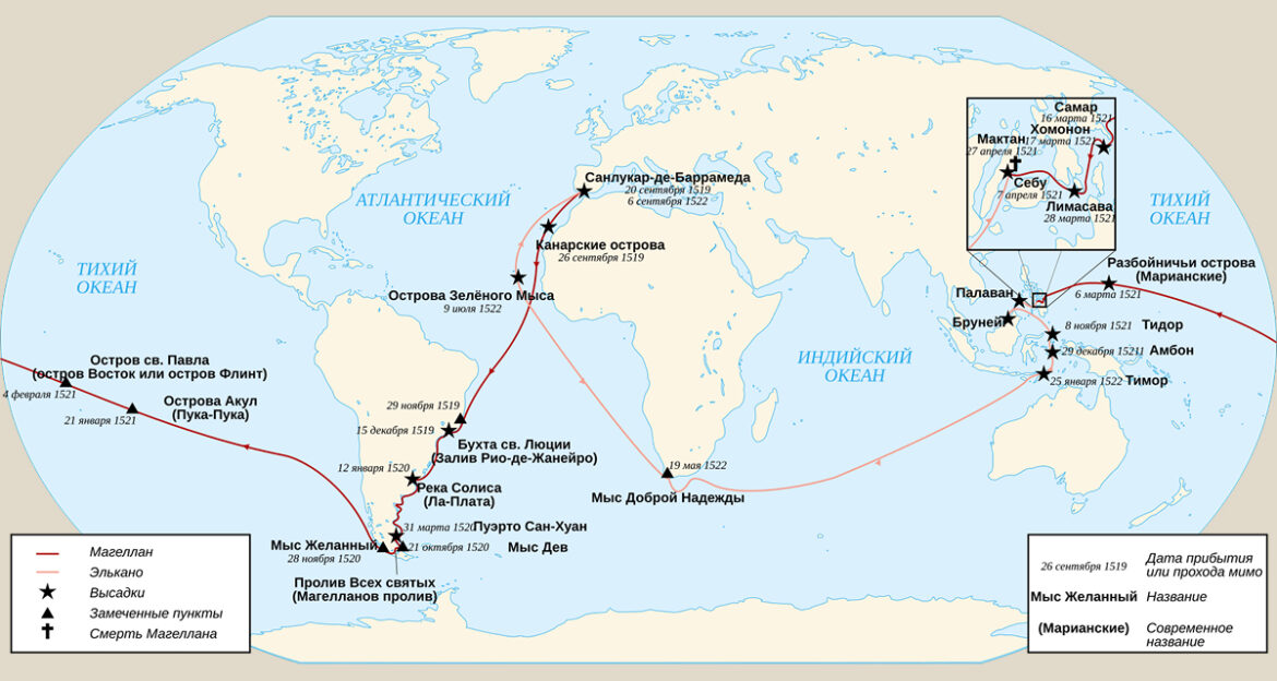- 1519 год. Фернан Магеллан (прим. ред.: португальский и испанский мореплаватель 1480-1521) возглавил экспедицию, которая отправилась из Испании, пересекла Атлантический океан, обогнула Южную Америку, а затем через Тихий и Индийский океаны достигла берегов Африки, и обогнув ее, вернулась в Испанию. Таким образом был открыт путь из Атлантического океана в Тихий и совершено первое кругосветное путешествие.