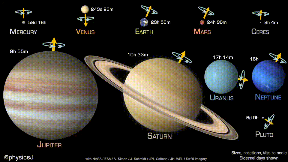 Все планеты Солнечной системы имеют разную суточную скорость вращения и свой угол наклона оси вращения. Например, Меркурий и Юпитер почти не имеют наклона оси вращения, а вот Уран почти «лежит» на боку: угол наклона его оси к плоскости орбиты составляет 97,77 °. Сутки тоже у всех разные: оказавшись на Венере, вы будет ждать 243 земных дня, пока произойдет один оборот этой планеты вокруг своей оси, а вот на Юпитере это займет всего 9 часов 50 минут. Сатурн, Юпитер, Уран и Нептун — все эти газовые планеты-гиганты вращаются достаточно быстро: сутки занимают от 9 часов 50 минут на Юпитере до 17 часов 14 минут на Уране.