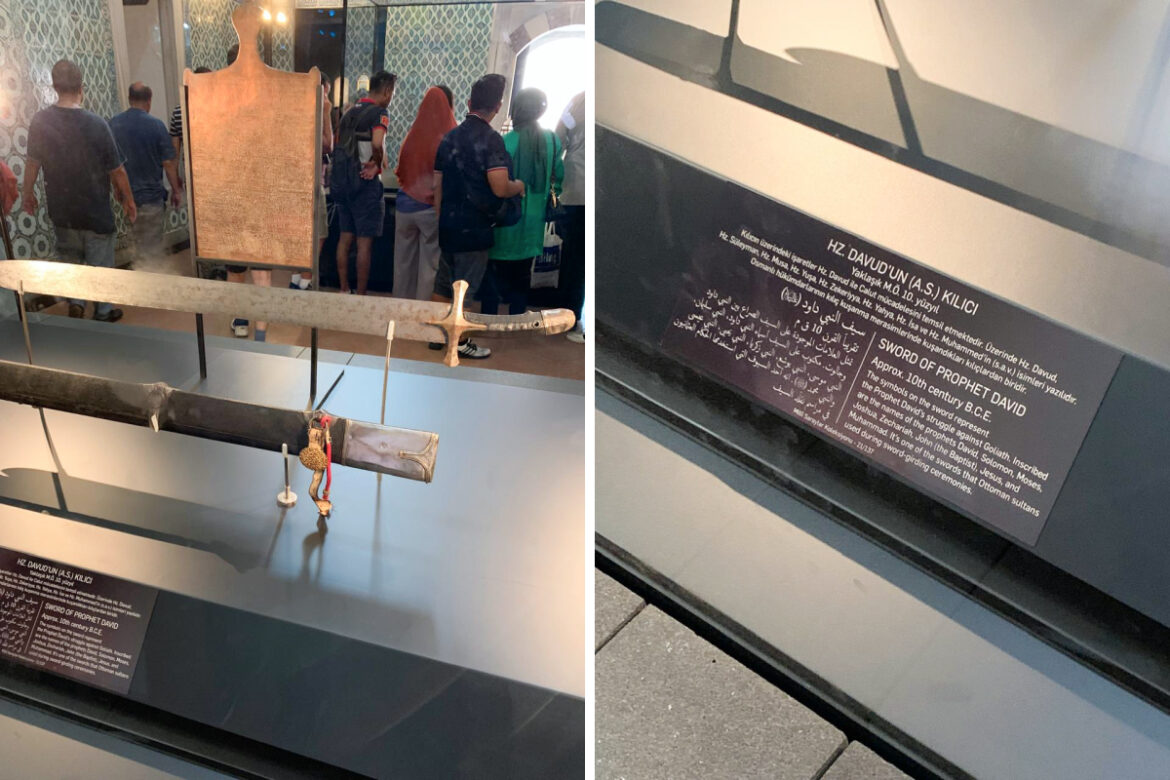 Одним из таких памятников является так называемый меч царя Давида, который хранится в Священном дворце музея Топкапы в Стамбуле и связан как с монархической властью османских султанов, так и с традицией мусульманского вероисповедания. Меч покоится среди прочих реликвий, собранных в отдельном помещении: здесь можно увидеть посох Моисея (прим. ред.: в исламской традиции – Муса), мощи Иоанна Крестителя (прим. ред.: в исламской традиции Яхья ибн Закарийя), многочисленные сабли и мечи пророка Мухаммада и проч.