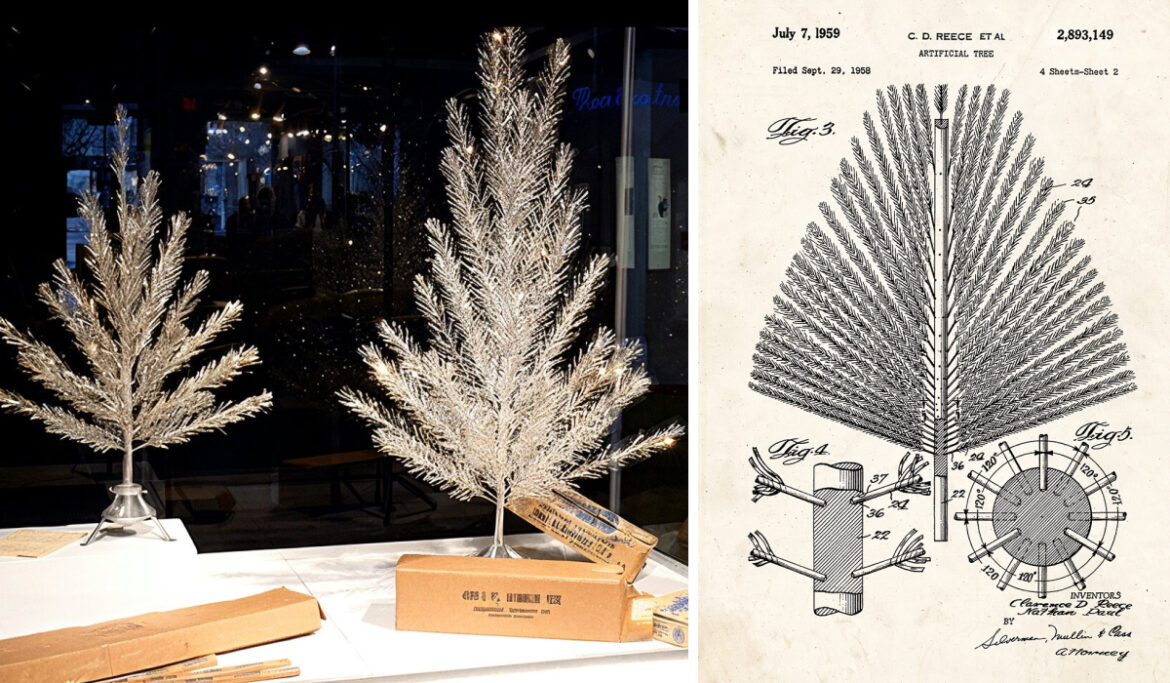 - 1958 год. США. В конце 1950-х компания Modern Coatings, Inc из Чикаго запатентовала елку из алюминия: ствол и ветви конструкции скручивали из проволоки, а иголки делали из фольги. С 1960 по 1970 год было произведено более миллиона алюминиевых елок по 25 долларов каждая. В 1960-е годы их экспортировали во многие страны, в том числе в СССР.