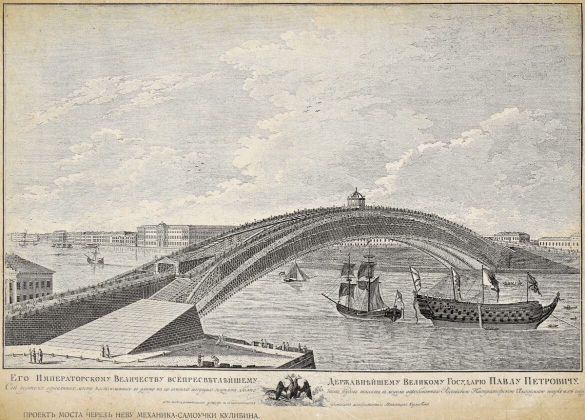 По-настоящему прорывным для технологий того времени стал проект одноарочного деревянного моста через Неву, разработанный Кулибиным в 1772 году. Сама концепция арки была не нова, однако уникальность проекта была в беспрецедентном масштабе — подобные мосты длиной 300 метров были чем-то немыслимым для XVIII века. При этом Кулибин придерживался научного подхода. Он построил реальную модель в масштабе 1:10 и испытал ее под огромными нагрузками. Руководство академии наук также подтвердило точность расчетов, однако проект так и не был реализован из-за отсутствия подходящих технологий строительства. Первый 300-метровый одноарочный мост был построен только в начале XX века в Санкт-Петербурге.