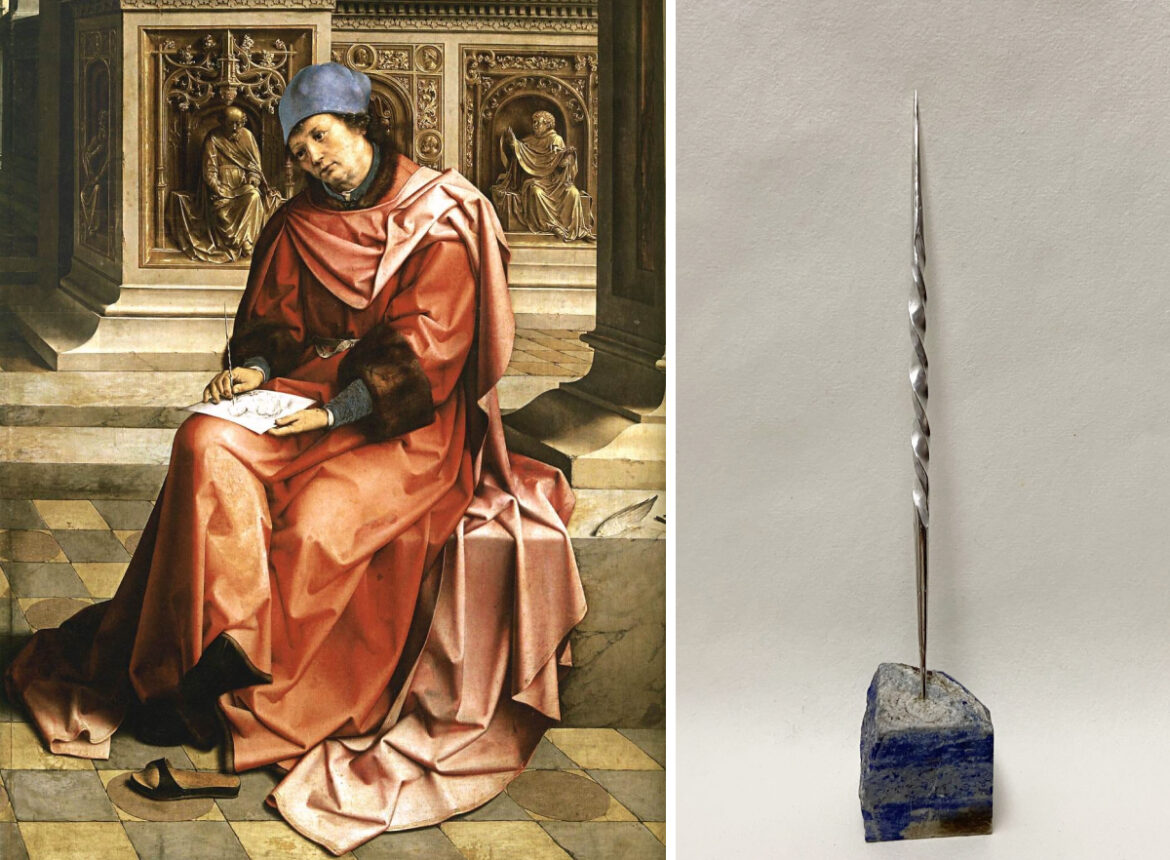 - Серебряный карандаш, а также серебряную иглу или серебряный штифт изготавливали следующим образом: стержень затачивали и закрепляли в каком-нибудь держателе или припаивали серебряную проволоку к металлической ручке. Карандашом с серебряным стержнем, так же как и свинцовым, писали и рисовали: в XV-XVII веках техника серебряного карандаша была особенно популярна в Италии, Германии и Нидерландах. Итальянский художник Раннего Возрождения Ченнино Ченнини в своем сочинении «Книга об искусстве, или Трактат о живописи» советовал работать серебряным штифтом по нанесенному на дерево, пергамент или бумагу костяному грунту, «легко касаясь… чтобы то, что ты начал рисовать, было едва заметно, постепенно усиливая штрихи, по нескольку раз возвращаясь к теням». «Серебряный стилус» требовал точности, поскольку выполненный им рисунок стереть было невозможно. Но его достоинство как материала для рисования заключалось в том, что линии получались тонкими, благородного серо-голубого цвета. По мере окисления серебра, также как и при использовании свинцового карандаша, штрихи становились коричневатыми, будто покрывались патиной времени.