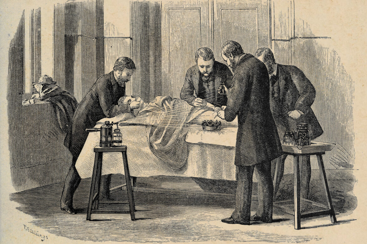 - Антисептики. В XIX веке открытие принципа действия антисептиков сыграло важную роль в развитии медицины. Такие вещества, как карболовая кислота, начали наносить на раны и хирургические инструменты перед операциями. Антисептики широко используются и в наши дни, однако они имеют множество ограничений при лечении инфекций. К ним относятся высокая токсичность, малая проникающая способность и выборочное воздействие на определенные группы бактерий. В то же время зародилась асептика — совокупность врачебных правил для заблаговременного предупреждения попадания инфекции в рану. В XIX веке асептические методы включали кипячение и паровую обработку повязок, мытье рук в хлористом растворе, пропитку перевязочных материалов в карболовой кислоте и стерилизацию операционных помещений. Одним из первых российских медиков, широко пропагандировавших антисептические средства и принципы асептики, был Николай Склифосовский.