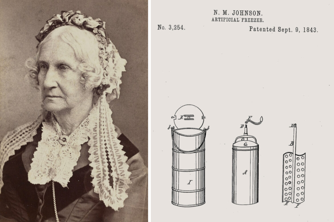 Идея вращения во льду емкости с мороженым ради его взбивания и охлаждения лежала и в основе первых механических фризеров. Точное время их появления назвать сложно, но первый патент на усовершенствованную ручную мороженицу получила в 1843 году американская домохозяйка, прославившаяся как изобретатель, — Нэнси Мария Джонсон. Ее «Искусственный морозильник» представлял собой двухчастную конструкцию: деревянное ведро, заполненное колотым льдом с солью, и помещавшийся в него контейнер, оснащенный ручкой и идущим от нее внутрь вертикальным стержнем с двумя лопастями. Вращаясь, они собирали лед, образующийся на стенках в процессе охлаждения и взбивания сливочной смеси, он насыщал взбиваемую массу и тем самым понижал ее температуру, а проделанные в лопастях дырочки облегчали их движение.