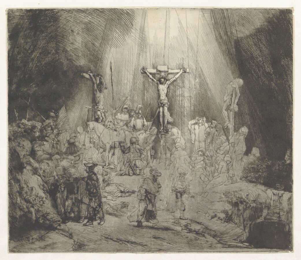 Рембрандт Харменс ван Рейн, голландский художник XVII века, внес большой вклад в развитие офорта, который сочетал с другими приемами. В своей знаменитой гравюре «Три креста» (1653) он использовал разные техники – не только офорта, но и резцовой гравюры и «сухой иглы». Всегда самостоятельно печатавший оттиски, Рембрандт сделал на сей раз пять вариантов – так называемых «состояний», в которых зафиксированы те изменения, которые вносил художник в композицию.